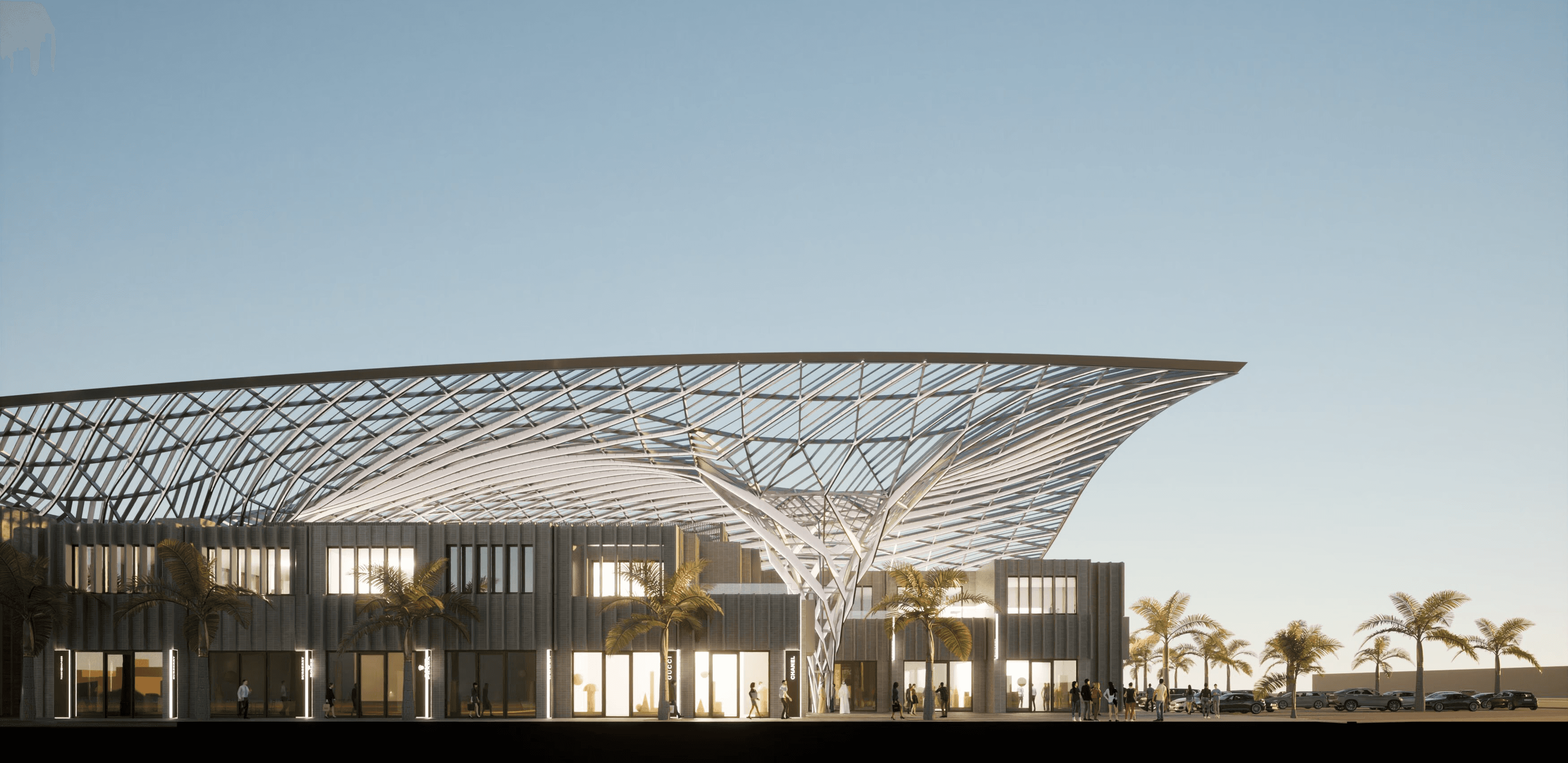The most notable design feature is the project's extensive roof canopy. Taking inspiration from the fluidity of organic forms found in undulating sand dunes and boat sails, the design was achieved with rigorous exploration of advanced computational tools intended to optimize comfort, structural performance, design, and climate analysis.